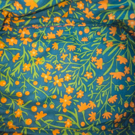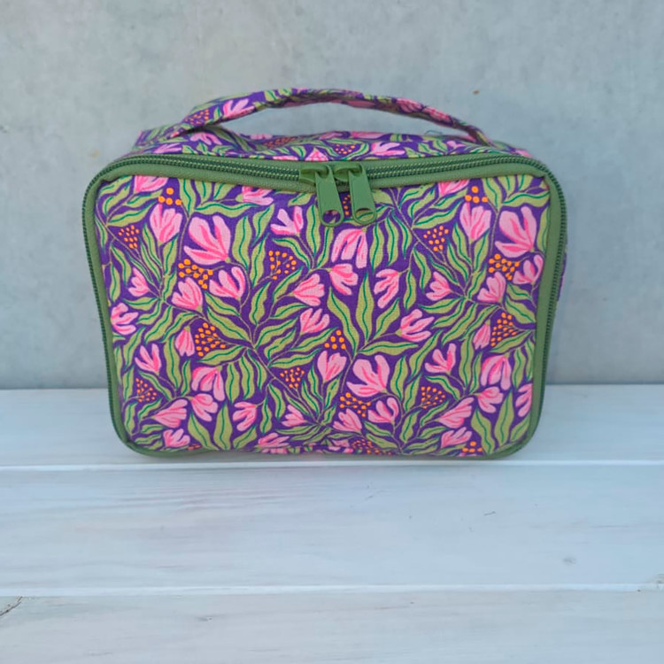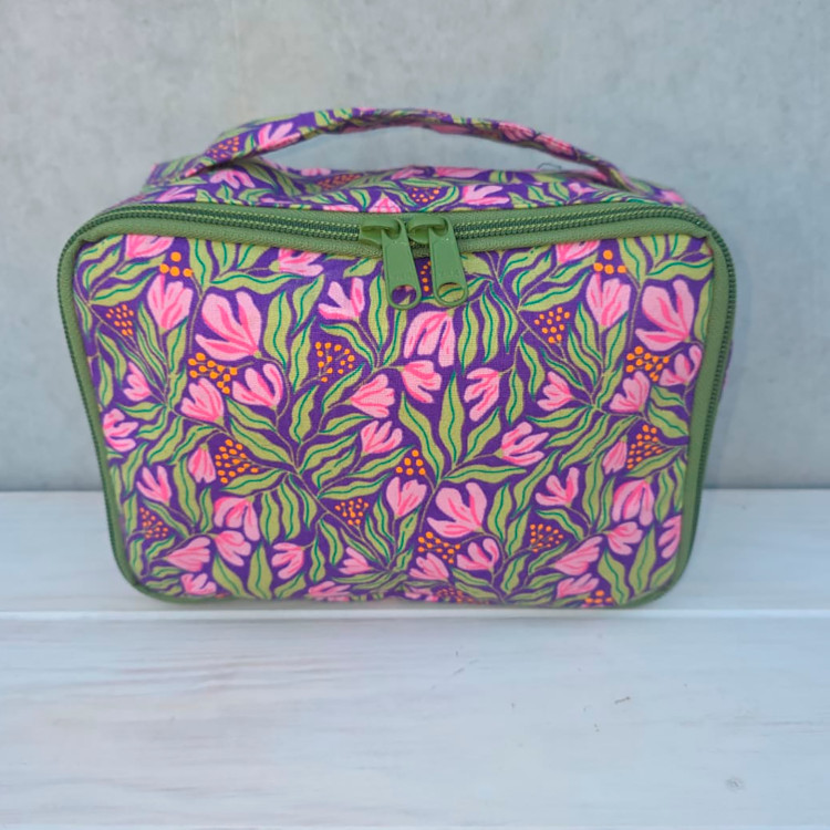 Neceser de algodón con forro estampado y bolsillo interior, es tipo maleta y se cierra con cremallera por tres lados, muy practica para neceser de viaje o fin de semana