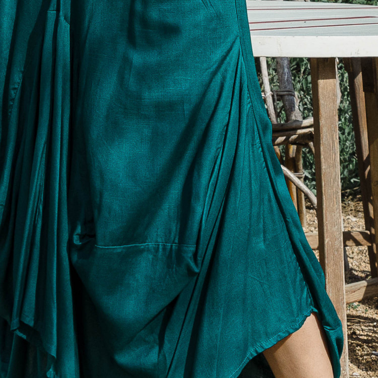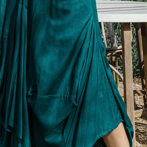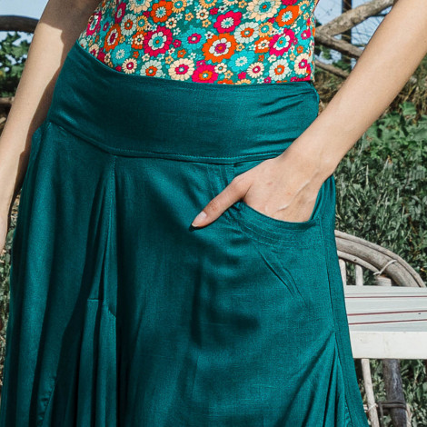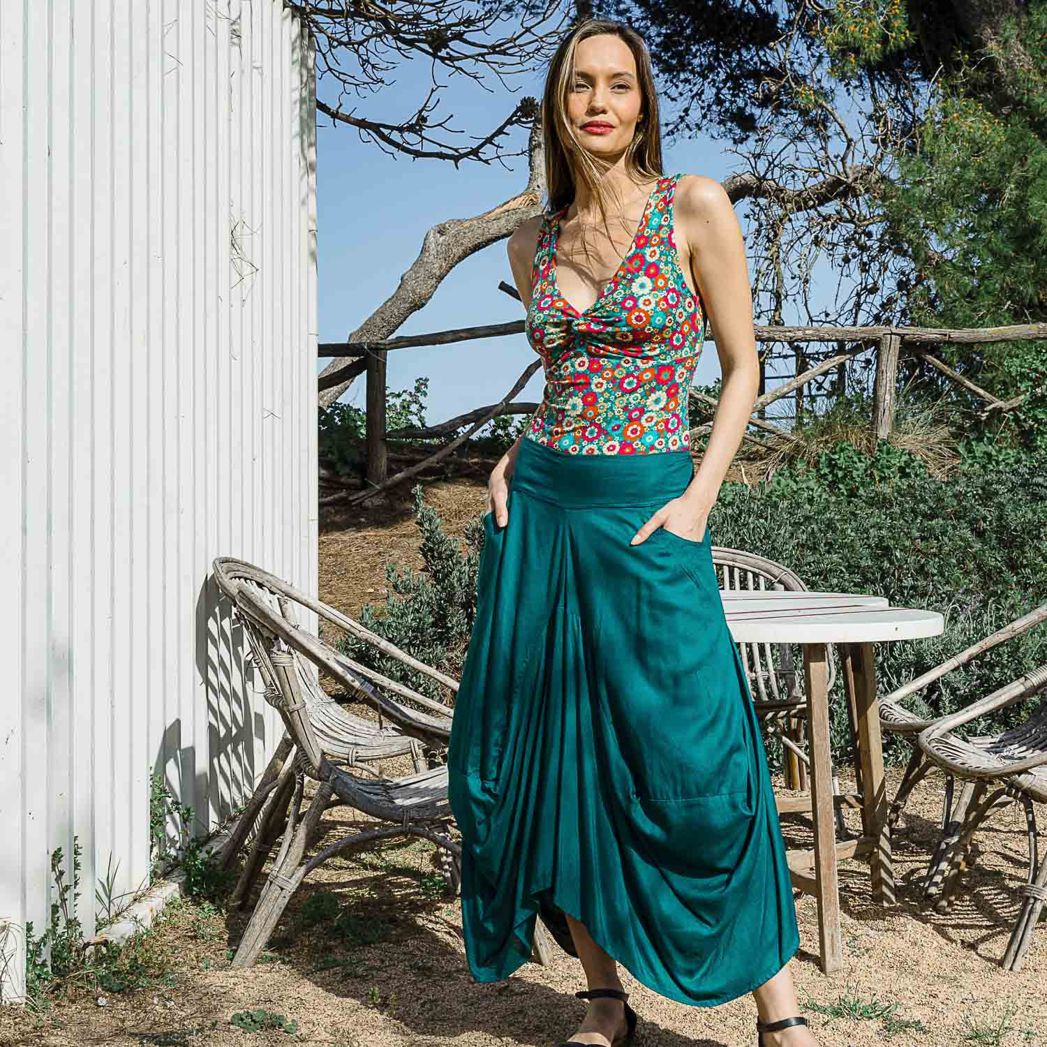 Falda de algodón, tiene dos bolsillos delanteros y cintura con goma trasera que ajusta bien diferentes tallas en una