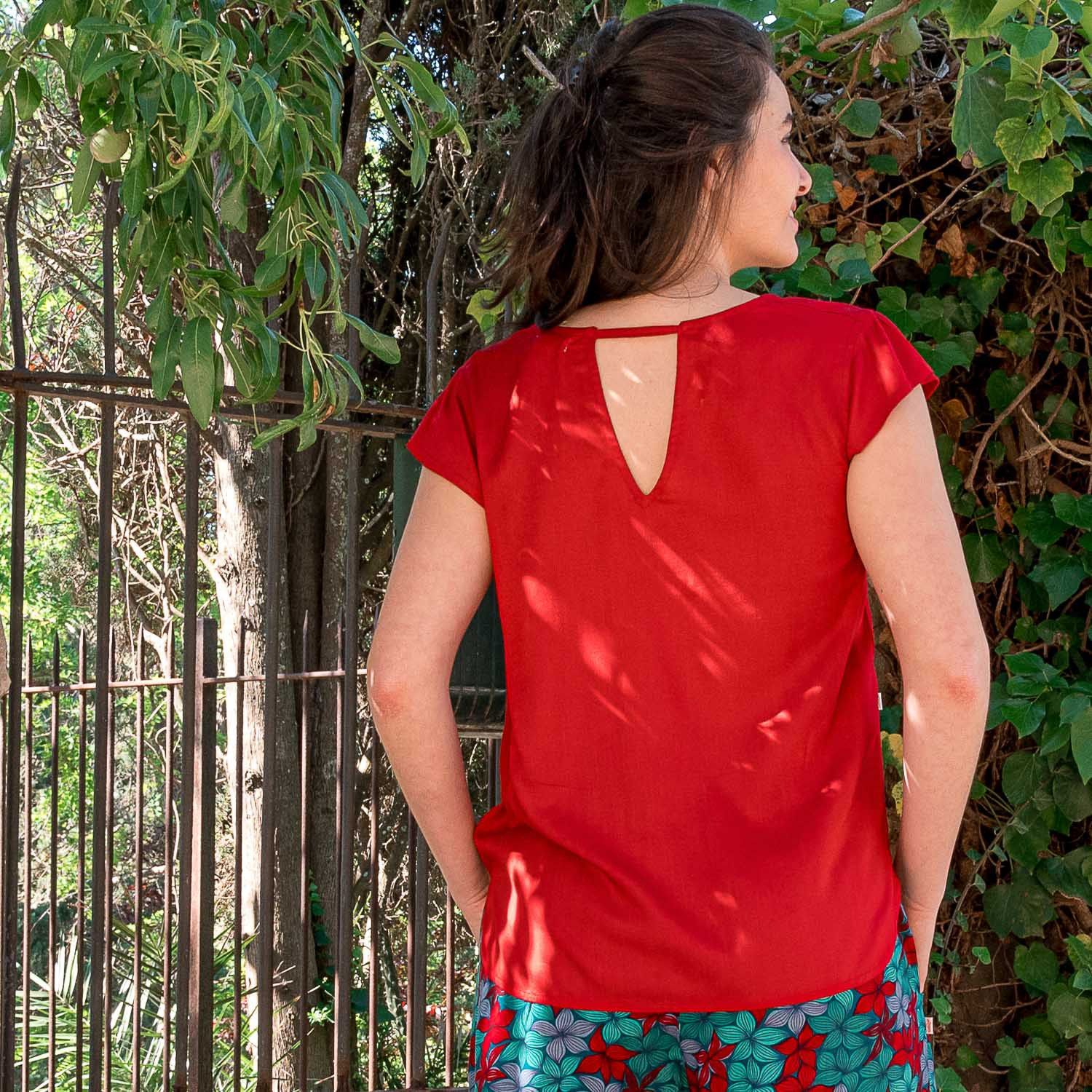 Top de rayón con manguita corta, escote delantero y trasero abierto en uve